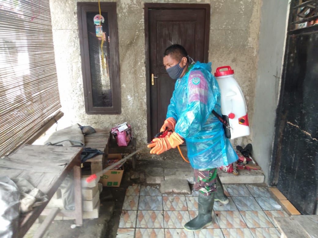 Banten, skalainfo.net | Babinsa Koramil 0219/Cikande Kodim 0602/Serang Serda Andin Rahmat H, melaksanakan kegiatan Penyemprotan Disinfektan ke rumah-rumah warga di Desa Ketos Kecamatan Kibin Kabupaten Serang Banten, (08/04/2020)