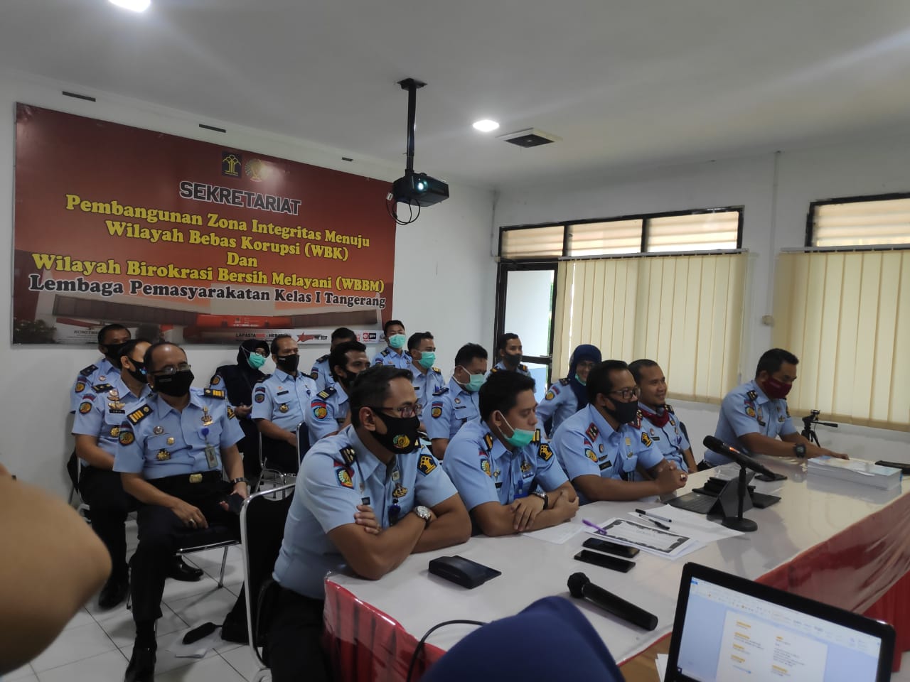 Kegiatan evaluasi dan penilaian pembangunan Zona Integritas (ZI) menuju WBK/WBBM oleh Tim Penilai Internal (TPI) Inspektorat Jenderal ini diikuti oleh seluruh tim pembangunan zona integritas Lapas Kelas 1 Tangerang, mulai dari Kalapas Jumadi sebagai Penanggung Jawab, Kabid Giatja Andi Wijaya Rivai selaku ketua tim kerja Pembangunan ZI serta seluruh koordinator bidang area perubahan.