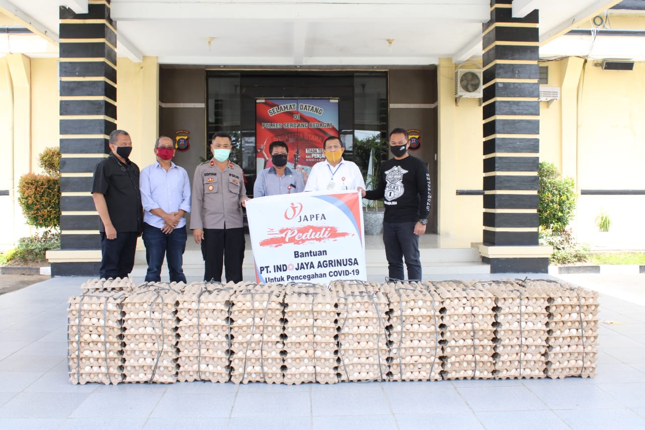 Pemberikan bantuan sebanyak 6000 butir telur diserahkan langsung oleh Chairman Excecutive Liasion Officer PT. Indo Jaya Agrinusa Brigjen Pol (Purn) Faisal Abdul Nasir kepada Polres Serdang Bedagai, bantuan telur tersebut diterima langsung oleh Waka Polres Serdang Bedagai Kompol Sofyan, dengan didampingi Kasat Reskrim AKP Pandu Winata dan Kasubbag Humas Polres Serdang Bedagai IPDA Zulfan Ahmadi.