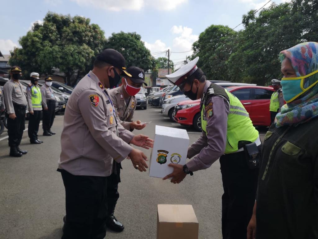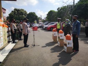 elang perayaan hari raya Idul Fitri 1441 H – 2020 M yang tinggal hitungan hari, Kapolsek Neglasari Kompol R. Manurung memberikan bingkisan lebaran secara simbolis terhadap perwakilan anggota, staf dan pekerja harian lepas (PHL) bebarengan dengan apel pagi halaman Polsek Neglasari, Kota Tangerang, Rabu (20/5/2020).
