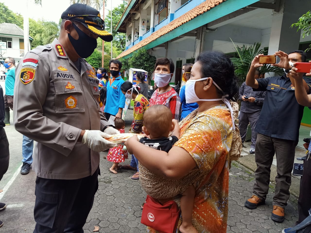 “Hari ini kita bagikan bantuan berupa pakaian jadi masing-maaing dua stel,” ujar Kombes Audie.