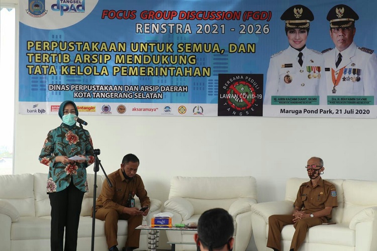 Tangsel, Skalainfo.net| Walikota Tangerang Selatan (Tangsel), Airin Rachmi Diany hadiri FGD Dinas Perpustakaan dan Arsip Daerah di Gedung Dinas Perpustakaan dan Arsip Daerah, Serpong, 21/07/2020. FGD ini dilakukan untuk menyusun Recana Kerja Startegis tahun 2021 sampai dengan 2026.