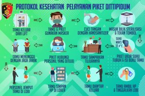 “Prosedur diawali dengan tibanya tamu di lobi lantai 4 Gedung Awaloedin Djamin dari pintu lift, tamu diwajibkan untuk menggunakan handsanitizer yang memang sudah disediakan, masuk ke chamber sterilisasi, diukur suhu badan dengan thermo-gun oleh piket baru kemudian mengisi buku tamu untuk disambungkan dengan tujuan kepentingan,” kata Akbp Shinto Silitonga, Kasubagopsnal Dittipidum yang bertangunggjawab pada standarisasi pelayanan piket di Dittipidum Bareskrim Polri. Setelah bertemu dengan penyidik di lobi, maka tamu wajib menyimpan handphone dan alat komunikasi lainnya di dalam loker yang telah disiapkan, dimana tamu sendiri yang membawa kunci loker. “Hal ini dilakukan mengingat ruang penyidikan adalah restricted area atau area terbatas” kata BJP Ferdy Sambo, Dirtipidum Bareskrim Polri. Sosialisasi terus menerus dilakukan tidak hanya dengan informasi melalui sticker, namun juga melalui video kreatif.Rabu, ((22/07/2020),