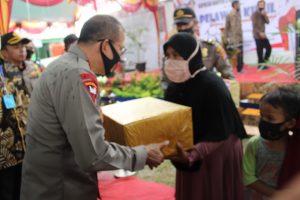 Dalam kesempatan ini Wakapolda Banten Brigjen Pol Wirdhan Denny juga memberikan bantuan paket sembako yang diserahkan secara simbolis kepada 6 orang warga Kp. Pelawad Kidul. (Wahyu/red),