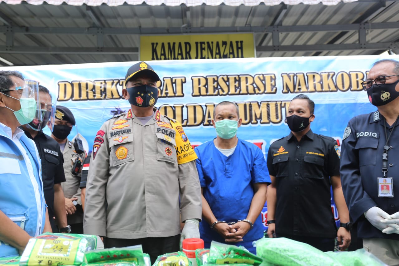 Kapolda Sumut mengatakan dari hasil barang bukti yang disita berupa 100 kg Sabu berhasil menyelamatkan 1 juta anak bangsa serta 50 ribu butir pil ekstasi berhasil menyelamatkan 50 ribu anak bangsa