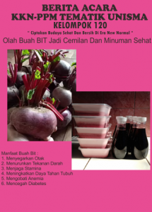 - Refleksi Sosial : Karena refleksi sosial diperuntukkan menumbuhkan kesadaran para warga mengenai suatu permasalahan, maka setelah melakukan pengamatan di Desa tersebut, kelompok 120 membuat program kerja yakni mempelajari penanaman sayur dan buah organik di GAPOKTAN (Gabungan Kelompok Tani), bersama ibu-ibu KWT Desa tersebut serta bagaimana cara pengolahan hasil dari kebun tersebut. Disini kelompok 120 berinovasi untuk membuat olahan dari buah bit menjadi sirup dan ice cream yang nantinya mungkin bisa diterapkan dan dijual sehingga membantu pereknonomian Desa. Buah bit sendiri mempunyai manfaat yang cukup banyak yaitu menurunkan tekanan darah tinggi, mencegah anemia, menambah stamina, meningkatkan imunitas, mencegah kolesterol, dan dapat menjadi obat jantung. Rasa yang sangat khas dari buah bit sendiri membuat kami kelompok 120 berinovasi dalam mengolahnya agar kalangan anak-anak pun mau memakannya, buah bit ini kami olah menjadi ice cream dan sirup.