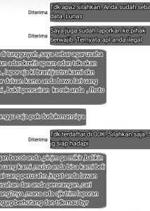 Dari hasil konfirmasi langsung yang kerap korban mendapatkan teror kata kata kotor, penekanan dan beberapa screen shoot percakapan antara pihak debcolector dengan pihak yang meminjam serta daftar aplikasi pinjaman online yang kerap bertindak bar-bar, seperti, aplikasi Duit Kita, Digi Dana, Pohon Koin dan masih banyak lagi lainnya. ( Tons/red),
