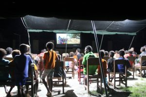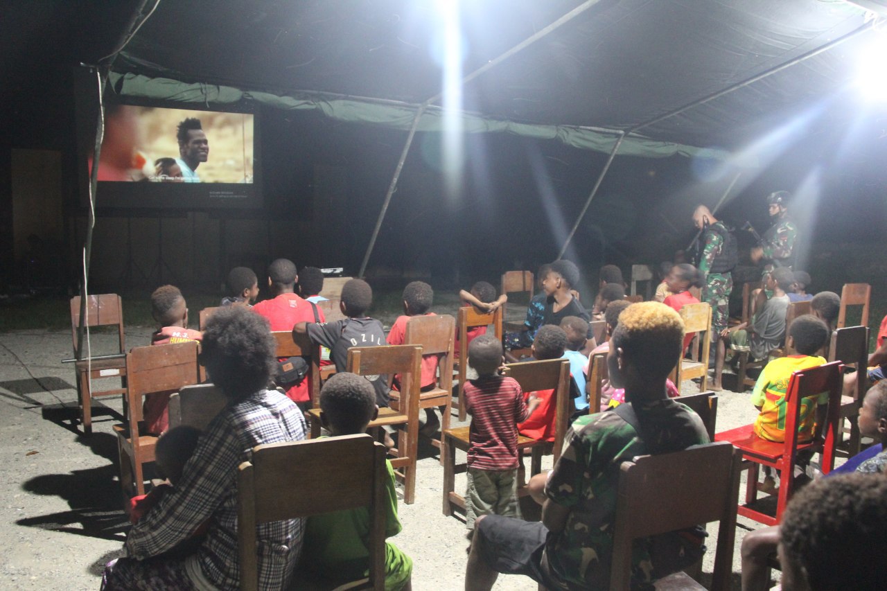 Papua, skalainfo.net | Jauh dari hiruk pikuknya kota-kota besar dimana anak anak pada umumnya dapat menonton bioskop,Televisi. Terinspirasi dari hal tersebut Satgas Pamtas RI-PNG Yonif Raider 100/PS gelar nonton bersama (Nobar) di Kampung Banda dengan peralatan layar tancap yang sudah disiapkan sejak sebelum berangkat operasi.