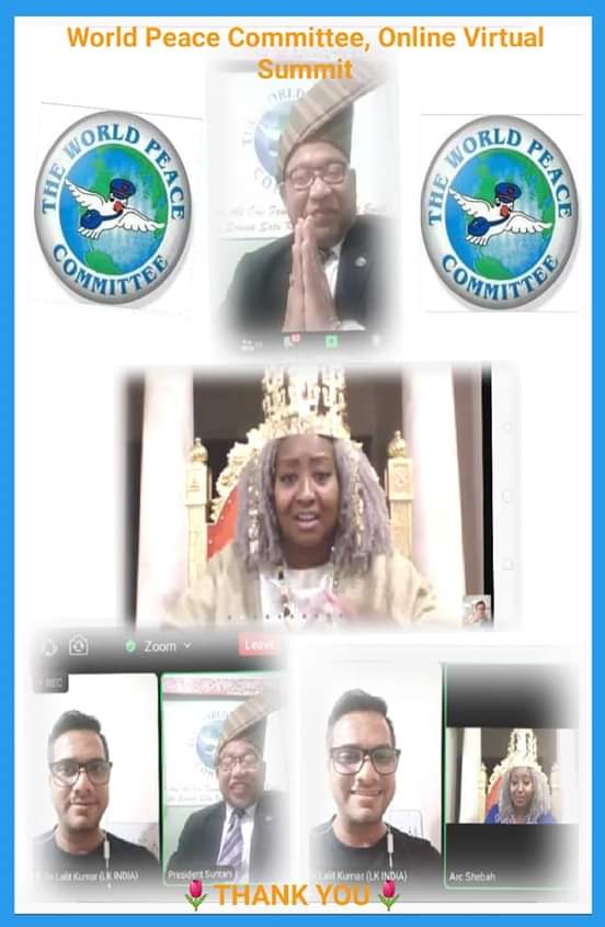 Pertemuan Puncak Perdamaian Virtual ini diselenggarakan dan diatur oleh upaya tulus dari Yang Terhormat Pendiri Presiden Organisasi Perdamaian paling favorit di Dunia Komite Perdamaian Dunia, 202 Negara – Yang Mulia Presiden Dr Djuyoto Suntani dengan Kolaborasinya yang tulus dengan Yang Mulia Kaisar Yang Mulia Ratu Syebah Yang Mulia III, Kerajaan Shebah, Afrika Selatan adalah puncak yang luar biasa dalam sejarah pertemuan online.