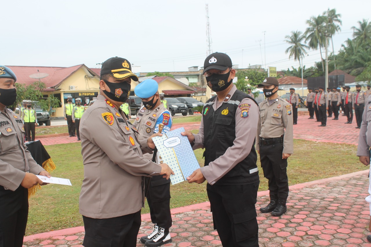 Pemberian piagam penghargaan di berikan kepada personil Kesehatan , propam , Intel , Narkoba dan reskrim .sebagai polisi terbaik di bulan ini. (Yusup/red),