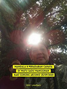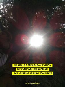siang itu jumat wage 25/09/2020 Kita mengalami sinkronisasi sinar cahaya matahari, udara alam raya dan kelembaban serta kerapatan skala energi enerjologi multidimensional di atas WATU SADU dan Pohon Besar yang duduk berdampingan dan bersebelahan di muka bhumi tersebut, telah menghasilkan tampilan “MANDALA ENERGI ENERJOLOGI” berbentuk Mandala 8 dan berwarna merah keunguan yang sangat bening jernih tampilannya, yang beruntungnya berulang kali Kita bisa menunjukkan sudut gambar tampilannya.