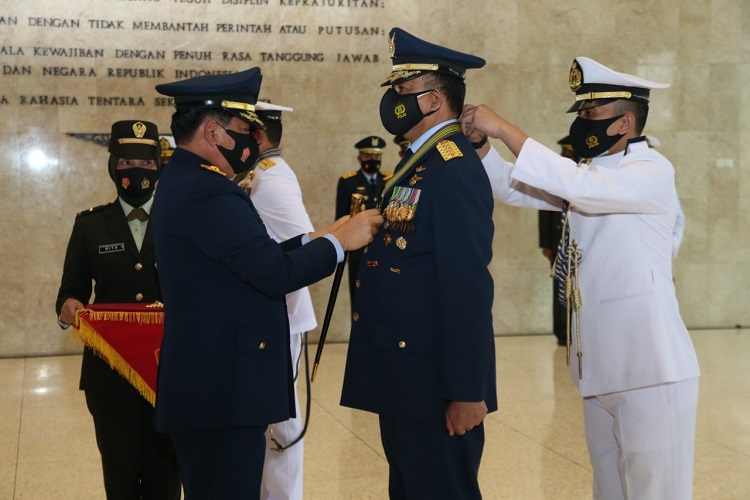 Jakarta, Skalainfo.net| Panglima TNI Marsekal TNI Hadi Tjahjanto, S.I.P., memimpin Upacara Penganugerahan Tanda Kehormatan Republik Indonesia kepada Kasal Laksamana TNI Yudo Margono, S.E., M.M., dan Kasau Marsekal TNI Fadjar Prasetyo, S.E., MPP. di Ruang Hening Gedung Soedirman Mabes TNI, Cilangkap, Jakarta Timur, Jumat 2/10/2020.
