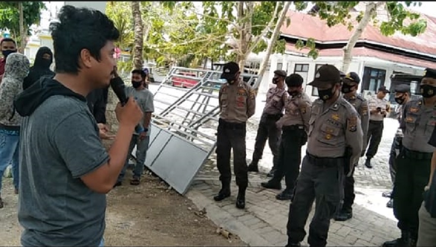 Sultra-Buton, Skalainfo.net| Puluhan jumlah warga masyarakat yang berbondong-bondong ingin memasuki halaman kantor Bupati Wakatobi dalam menyampaikan orasinya mengenai perampasan lahan dan juga meminta agar pelayanan terhadap masyarakat Wakatobi harus diperhatikan demi kesejahtraan dan kesetaraan terhadap warga Indonesia, Kamis 1 Oktober 2020.
