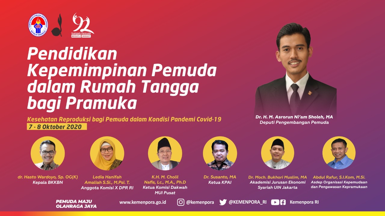 Hal ini disampaikan oleh Deputi Bidang Pengembangan Pemuda Kemenpora RI Dr. H.M. Asrorun Ni’am Sholeh, M.A dalam kegiatan Pendidikan Kepemimpinan Pemuda dalam Rumah Tangga bagi Pramuka; Kesehatan Reproduksi bagi Pemuda dalam Kondisi Pandemi Covid 19 yang diselenggarakan tanggal 7-8 Oktober 2020.
