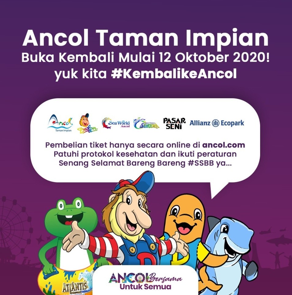 “Buat yang sudah lama kangen dan ingin sekali mengunjungi Ancol kini sudah dapat liburan ke Taman dan Pantai, Dunia Fantasi, Sea World Ancol, Ocean Dream Samudra, Allianz Ecopark, Pasar Seni, Putri Duyung Ancol, dan juga sejumlah restoran dan mitra yang berada di dalam kawasan Taman Impian Jaya Ancol,” terang Dept. Head Corporate Communication PT Taman Impian Jaya Ancol Rika Lestari melalui keterangan tertulisnya di Jakarta, Minggu (11/10/2020).