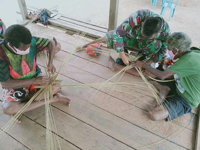 Beberapa personel memang sudah dibekali keterampilan anyaman lidi dari home base jauh-jauh hari sebelum berangkat ke Merauke. “Mereka juga ditempatkan di Pos yang terdapat kampung, sehingga keterampilan yang dimiliki dapat ditularkan kepada warga sekitar,” kata Dansatgas.