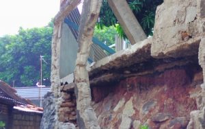 Tembok berusia sekitar 30 tahun itu berdiri di atas saluran air yang menyempit dengan lebar sekitar 1,5 meter, sehingga puing tembok berjatuhan menutup saluran air warga.