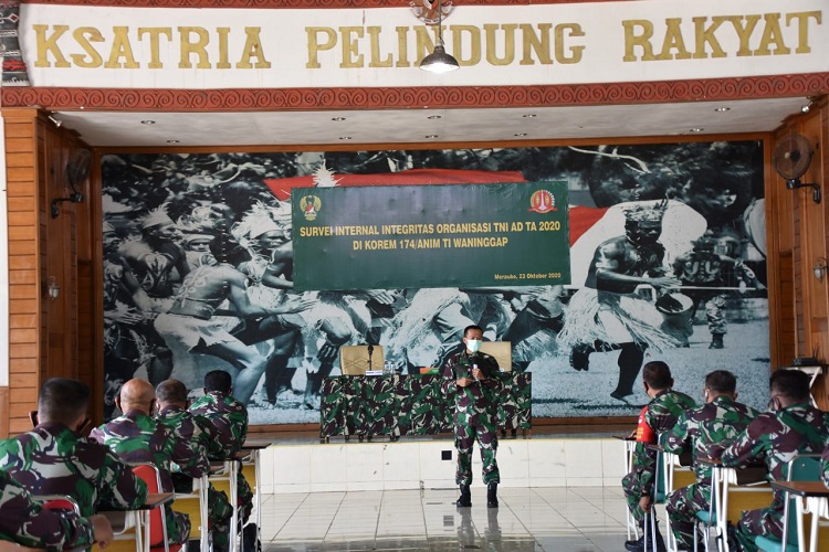 Sementara itu, Kolonel Inf Heri Cristanto sebagai Ketua Tim dari Srenaad menyampaikan bahwa Survei Integritas Organisasi TNI AD TA 2020 ini bertujuan untuk mengetahui sejauh mana pelaksanaan Zona Integritas di satuan kerja Korem 174/ATW Merauke.