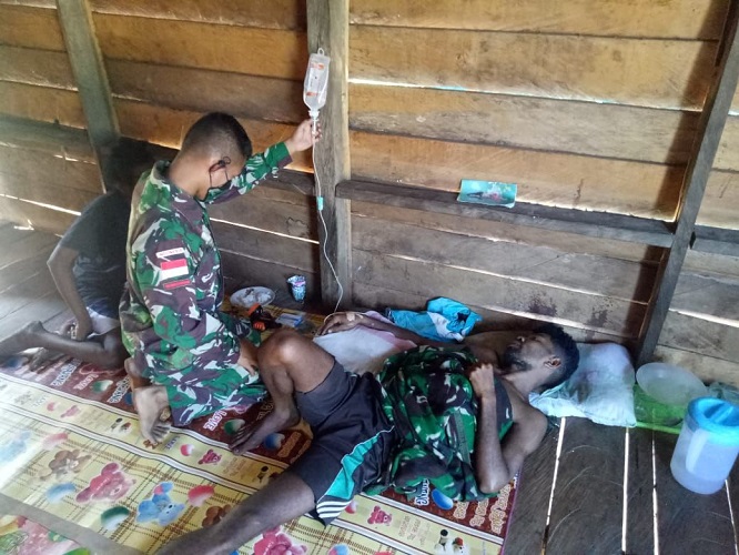 Lebih lanjut dikatakan, personel Satgas pun bergegas menuju ke rumah Ramli, kemudian setelah tiba di rumahnya langsung melakukan pemeriksaan. “Melihat kondisi Ramli yang menggigil dan sedikit lemas, Tim Kesehatan Satgas Yonif 125/Simbisa selanjutnya melakukan tindakan medis dengan memberikan cairan infus RL ecosol dan obat anti malaria,” terangnya.
