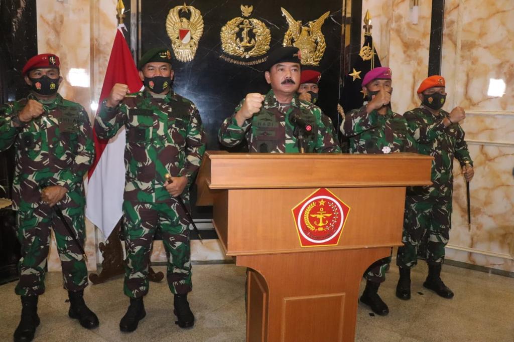 Jakarta, skalainfo.net | Bertempat di Subden Denma Mabes TNI, Jl. Merdeka Barat, Jakarta Pusat, Sabtu (14/11/2020), Panglima TNI Marsekal TNI Hadi Tjahjanto, S.I.P. didampingi Pangkostrad Letjen TNI Eko Margiyono, Komandan Koopssus TNI Mayjen TNI Richard TH. Tampubolon, Danjen Kopassus Mayjen TNI Mohamad Hasan, Dankormar Mayjen TNI (Mar) Suhartono dan Komandan Korpaskhas Marsda TNI Eris Widodo Y., memberikan pernyataan terkait pentingnya persatuan dan kesatuan demi menjaga stabilitas nasional.