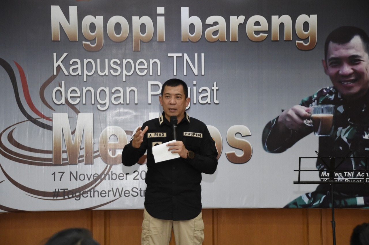 Hal tersebut dikatakan Kapuspen TNI Mayjen TNI Achmad Riad, S.I.P. pada acara pertemuan Keluarga Besar Puspen TNI dengan Pegiat Media Sosial, bertemakan “Ngopi Bareng Pegiat Media Sosial dengan Kapuspen TNI,” bertempat di Aula Balai Wartawan Puspen TNI Cilangkap, Jakarta Timur, Selasa, 17/11/2020.