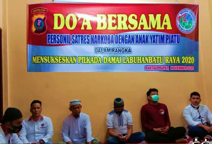 Labuhanbatu, Skalainfo.net | Satuan Reserse (Satres) Narkoba gelar doa bersama dengan 40 anak yatim piatu agar Pilkada di Labuhanbatu Raya Tahun 2020 terlaksana dengan sukses dan damai di Gedung Sat Narkoba Polres Labuhanbatu, Senin (23/11/2020) sekitar pukul 17.00 WIB.