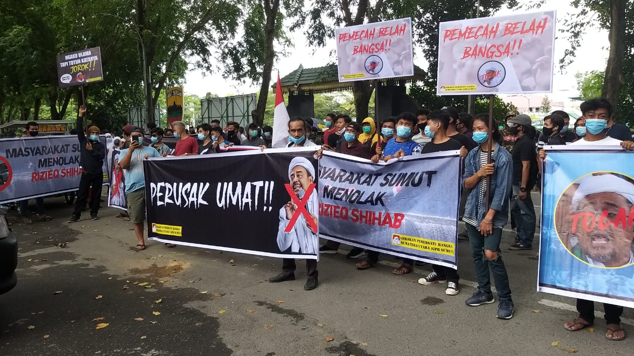 Tampak massa membawa sejumlah spanduk berisi foto HRS dan tulisan “Perusak Islam – Perusak Umat – Pemecah Belah Bangsa – Ngaku Ulama Tapi Tutur Katanya Jorok – Masyarakat Sumut Menolak Rizieq Shihab.”