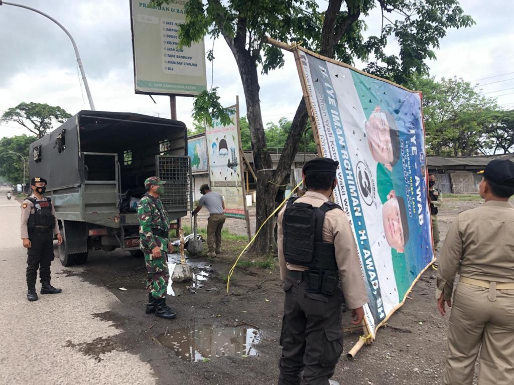 Cilegon, skalainfo.net | Memasuki masa tenang kampanye Pilkada 2020, Polres Cilegon dan TNI bersama Satpol PP melakukan Pengamanan dan pengawalan Kegiatan penertiban Alat Peraga Kampanye (APK) yang dilaksanakan oleh Tim Bawaslu Kota Cilegon di sepanjang jalur Protokol Kota Cilegon dan Masing – masing Panwascam Minggu (6/12/2020).