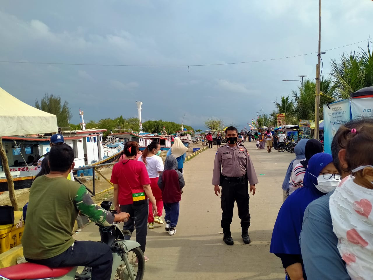 Tampak personel jajaran Polres Serang Kota dan Polsek Kasemen saat melakukan pengamanan serta memberikan himbau kepada para pengunjung dan masyarakat setempat.