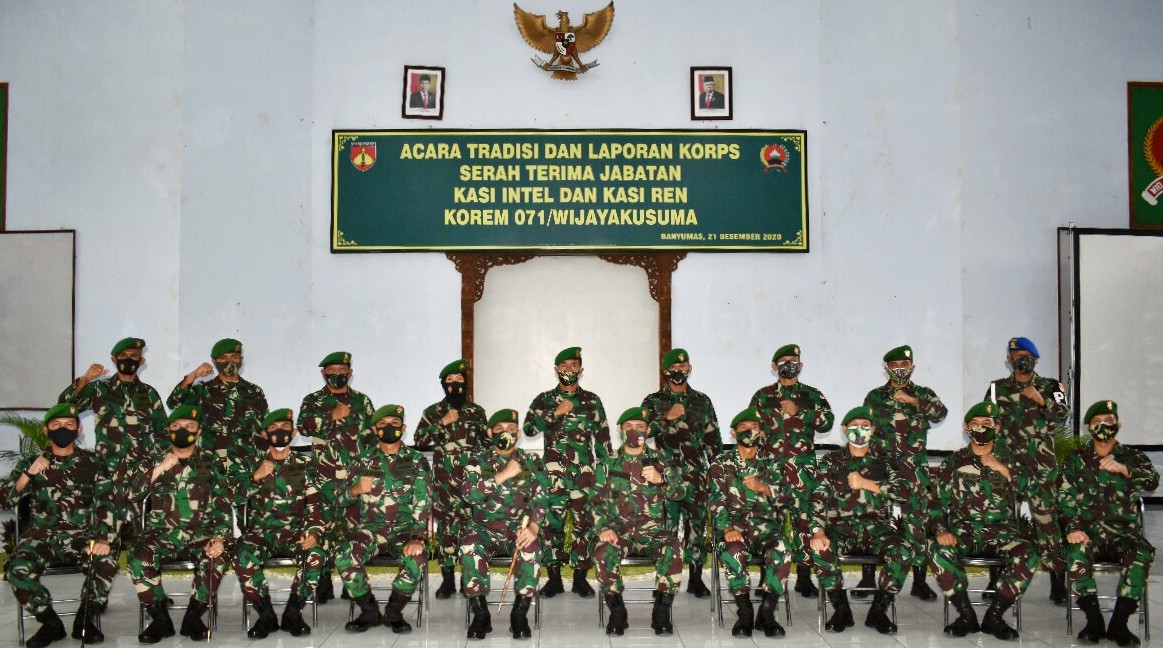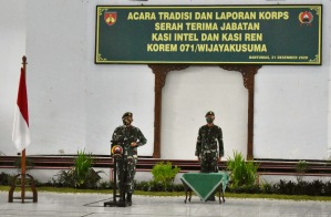Penyerahan tugas dan jabatan Ps. Kasi Intelrem 071/Wijayakusuma dari Danrem 071/Wijayakusuma kepada Mayor Inf Dimas Kurniawan dan Serah Terima Jabatan Kasiren Korem 071/Wijayakusuma dari Letkol Inf Sasono Haryadi kepada Mayor Inf Iwan Dwi Prihartono.