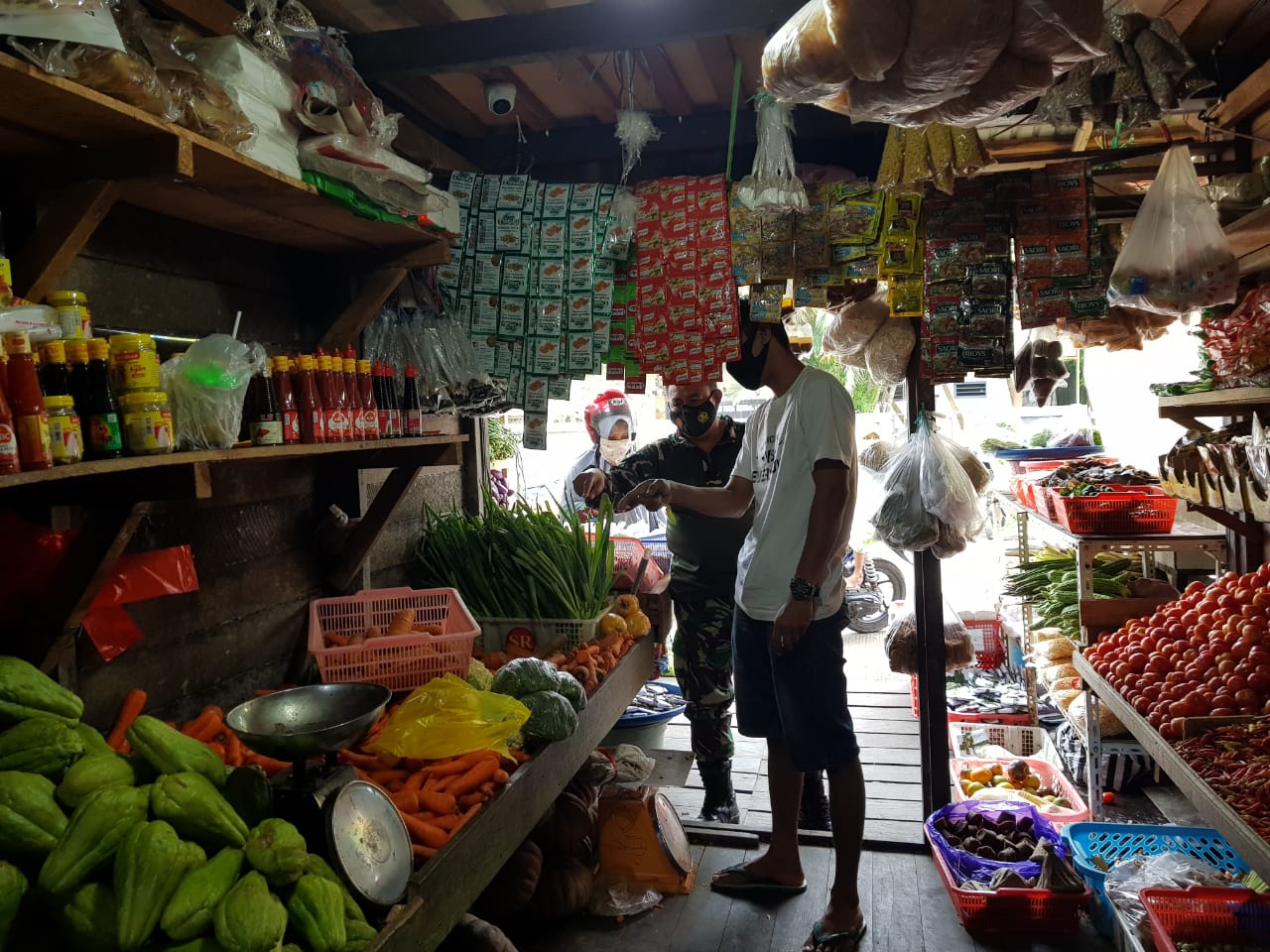 TENGGARONG, skalainfo.net | Babinsa Koramil 0906-01/Tenggarong Kota, Kodim 0906/Tenggarong Serka Umar yang merupakan Babinsa Kelurahan Melayu, turun ke pasar Teradisional di Jln. Maduningrat RT 15 mengecek harga bahan pokok, menjelang Natal Dan Tahun Baru 2021 di Kelurahan Melayu, Kecamatan Tenggarong, Kabupaten Kutai Kartanegara, Selasa (22/12/2020).