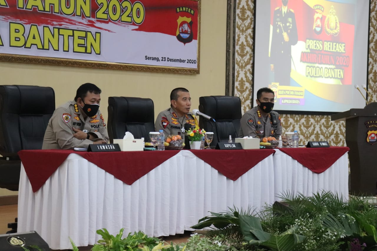 SERANG, skalainfo.net | Jelang akhir tahun, Kepolisian Daerah (Polda) Banten gelar press release untuk menyampaikan capaian Polda Banten sepanjang Tahun 2020 yang dilaksanakan di Aula Rupatama Mapolda Banten, Rabu (23/12/2020).