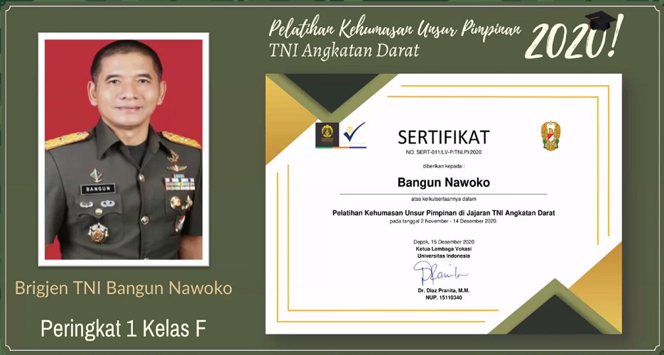 Merauke, Skalainfo.net| Brigjen TNI Bangun Nawoko yang sehari-hari menjabat sebagai Komandan Korem 174/Anim Ti Waninggap (Danrem 174/ATW) Merauke berhasil meraih peringkat 1 (satu) pada Pelatihan Kehumasan Unsur Pimpinan Tentara Nasional Indonesia Angkatan Darat (TNI AD) TA. 2020 yang diselenggarakan oleh Lembaga Vokasi Universitas Indonesia (UI).