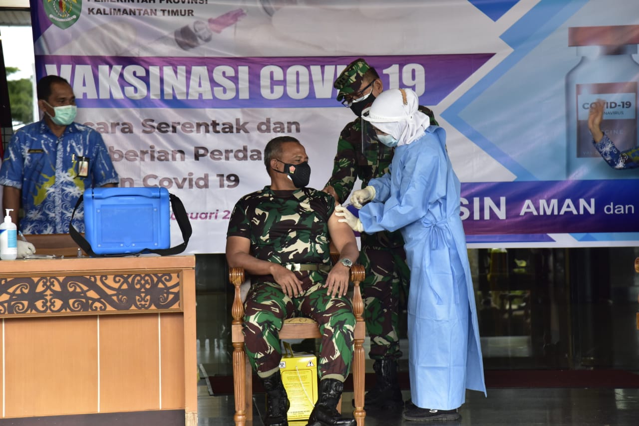 SAMARINDA, skalainfo.net | Panglima Kodam (Pangdam) VI/Mulawarman, Mayjen TNI Heri Wiranto, M.M., M.Tr. (Han) bersama sejumlah pejabat publik di Kalimantan Timur. Dimana menjalani Vaksinasi Covid-19, untuk pertama kalinya yang di gelar di Kantor Gubernur Kaltim, Kamis (14/01/2021).