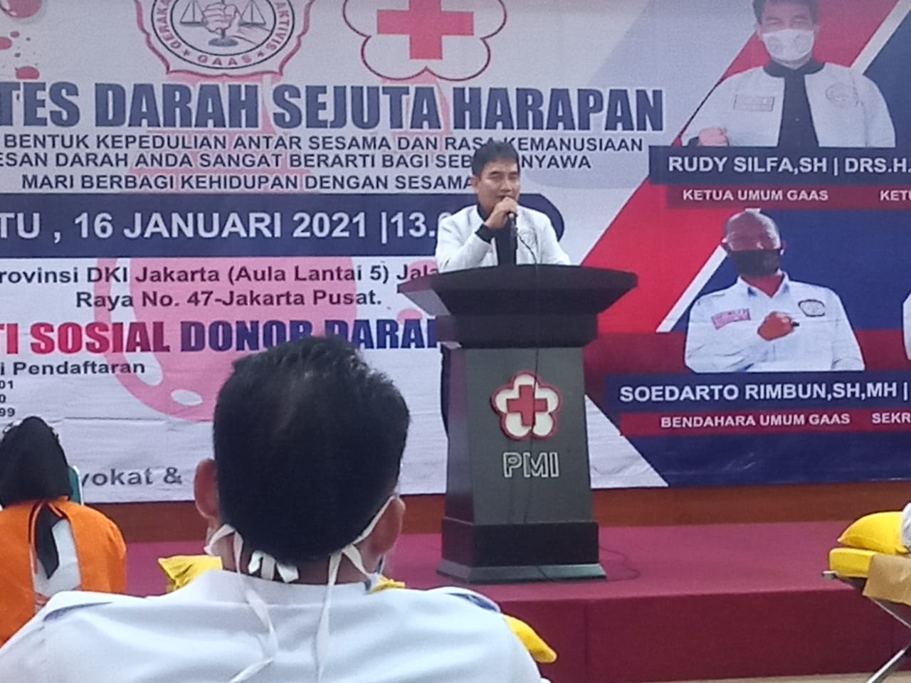Perwakilan PMI DKI Jakarta yang diwakili oleh H. Aceng menyampaikan pesan bahwa pihak Palang Merah Indonesia DKI Jakarta menghargai keikhlasan para peserta yang hadir Sabtu (16/1) siang. Untuk itu ia berharap DPP-GAAS untuk terus mengampanyekan pentingnya donor darah dalam menolong sesama. “Saat ini orang yang sangat bermanfaat bagi bagi orang banyaklah yang lebih utama,” tungkas Aceng dalam sambutanya.