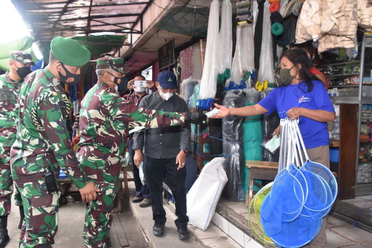 Tampak pedagang disekitar pasar didatangi perwira tinggi dari TNI-Polri ini. Sesekali memberikan masker yang sudah dibawa.