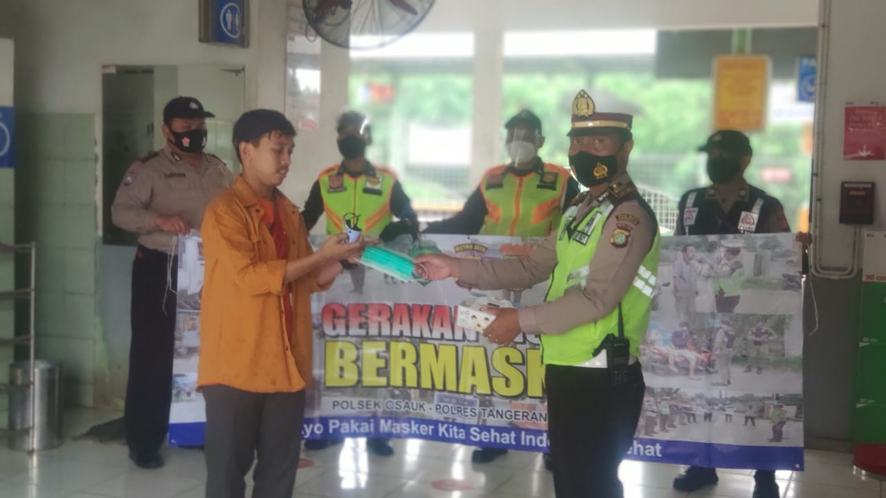 Giat pembagian masker oleh Polsek di bagi 2 titik dengan sasaran Masyarakat yang menggunakan sarana Transportasi Kereta Api Yaitu di Stasiun Cicayur, Cicayur Kelurahan. Cisauk Tangerang dan Masyarakat yang beraktivitas jual beli di Pasar Jengkol Jalan Raya Pasar Jengkol Kelurahan Babakan Kecamatan. Setu Kota Tangerang Selatan dengan personil sebanyak 6 Personil