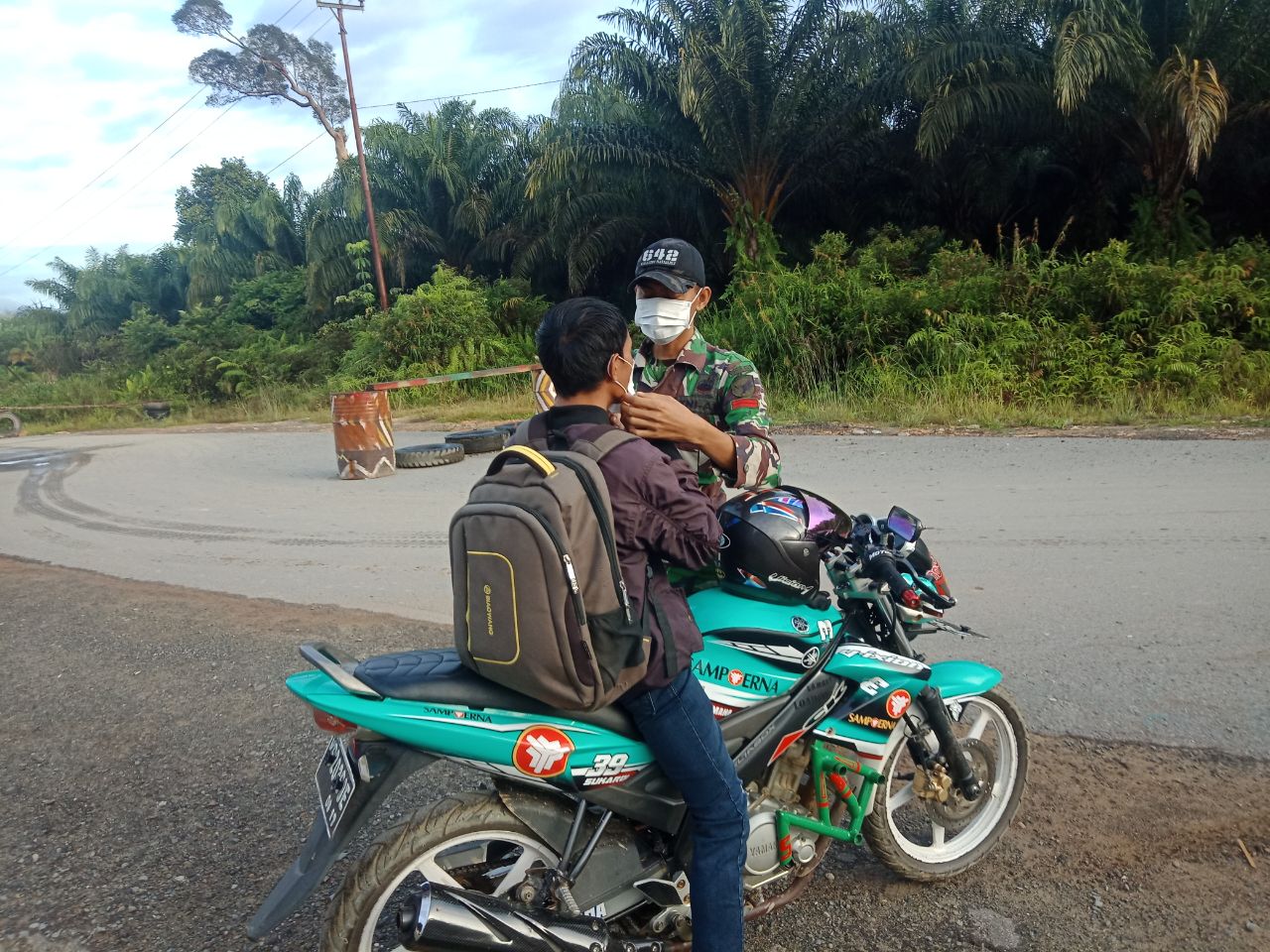 Sanggau-Kalbar, Skalainfo.net| Untuk mencegah dan menanggulangi penyebaran Covid-19, Satgas Pamtas RI-Malaysia Yonif 642/Kapuas yang berada dibawah Komando Pelaksana Operasi (Kolakops) Korem 121/ABW membagikan masker kepada masyarakat pengendara motor di depan Pos Pamtas Sei Daun, Jalan Malengang, Dusun Sei Daun, Kecamatan Sekayam, Kabupaten Sanggau.