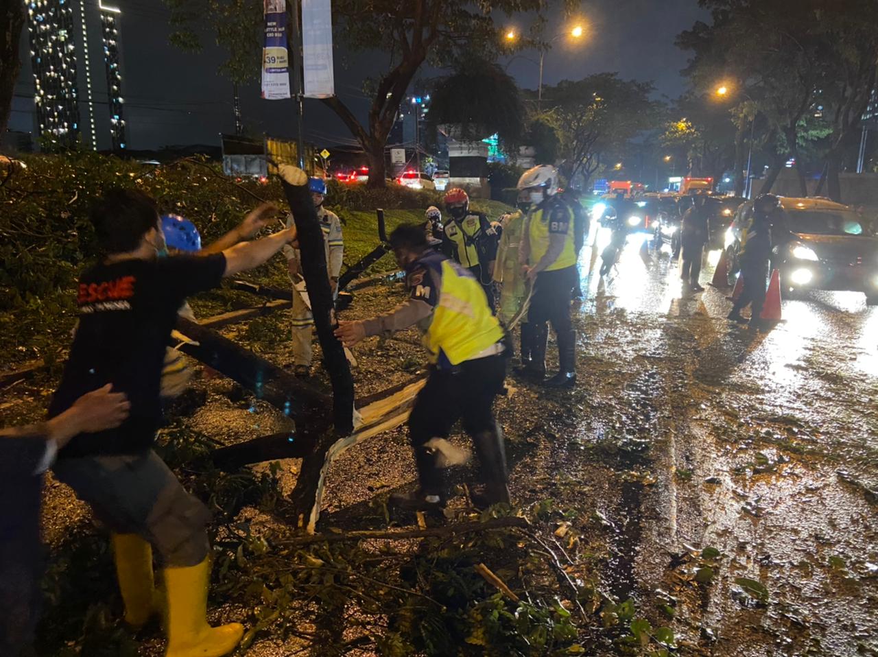 TANGSEL, skalainfo.net | Satuan Lalulintas (Satlantas) Polres Tangsel, mengevakuasi pohon tumbang di Jalan Raya Rawa Buntu Kota Tangerang Selatan, Senin malam (08/02/2021).