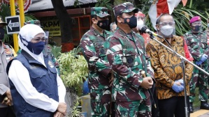 “Mudah-mudahan pada posisi hijau ini bisa dipertahankan, tetap melaksanakan protokol kesehatan dengan ketat, sesuai laporan dari Ibu Gubernur bahwa di Jawa Timur masih ada 210 RT yang masuk zona merah dan saya sudah perintahkan Pangdam V/Brawijaya untuk berkoordinasi dengan Kapolda Jawa Timur untuk terus memborbardir 210 RT tersebut, melakukan pelacakan dan isolasi serta diperketat pelaksanaan PPKM,” ujarnya.