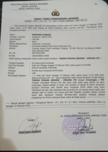Laporan atas nama Mintaria Gunadi, berdasarkan dengan nomor laporan, Nomor : STPL/134/B-1/II/2021/POlDA LAMPUNG/SPKT RES LU, pada hari Senin, 15 Februari 2021, sekira pukul 11.43 WIB.