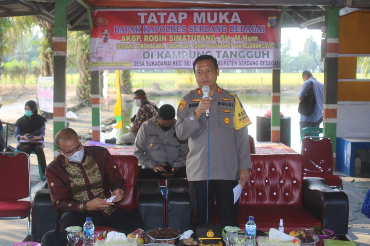 Serdang Bedagai, skalainfo.net | Kapolres Serdang Bedagai AKBP Robin Simatupang SH MHum meresmikan Kampung Bertuah dan melakukan sosialisasi kepada tokoh masyarakat tentangĀ penerapan PPKM skala mikro di Desa Suka Damai Kecamatan Sei Bamban, Kamis (18/2/2021) sore diĀ halaman rumah Kepala Desa Suka Damai.