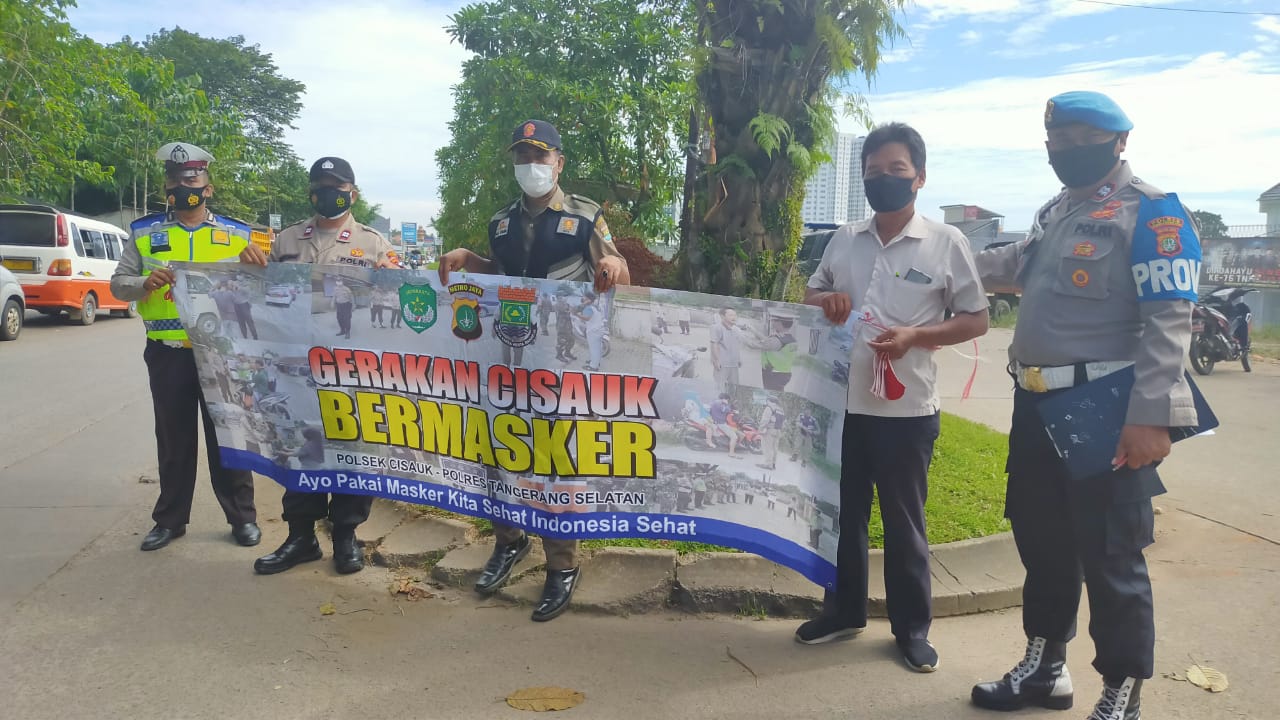 Giat pembagian masker oleh Polsek Cisauk dan 3 Pilar dilaksanakan di Jalan Lapan – Cisauk di depan Mako Polsek Cusauk, Desa Cibogo, Kecamatan. Cisauk Tangerang, kepada Masyarakat yang melintas jalan kaki maupun menggunakan kendaraan Roda 2 maupun Roda 4 atau lebih dengan personil sebanyak 11 Pers dengan Rincian sebagai berikut : Personil Polsek Cisauk 10 Personil, Trantib Kecamatan. Cisauk 1 Personil