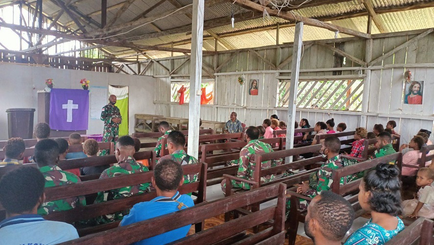 Boven-Digoel, Skalainfo.net| Personel Satgas TNI Manunggal Membangun Desa (TMMD) ke-110 Kodim 1711/Boven Digoel melaksanakan ibadah mingguan bersama masyarakat sekitar lokasi TMMD di Gereja Imanuel, Kampung Wanggom, Distrik Kawagit, Kabupaten Boven Digoel.