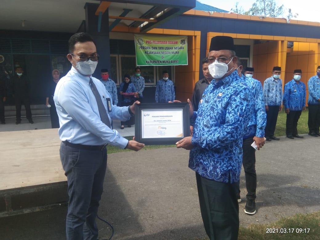 Mubar, skalainfo.net | Bupati Muna Barat Achmad Lamani menerima Penghargaan Dari Direktorat Kantor Pelayanan Pajak (KPP) saat upacara Hari Kesadaran Nasional, di halaman kantor Bupati Muna Barat, Rabu,(17/03/2021).