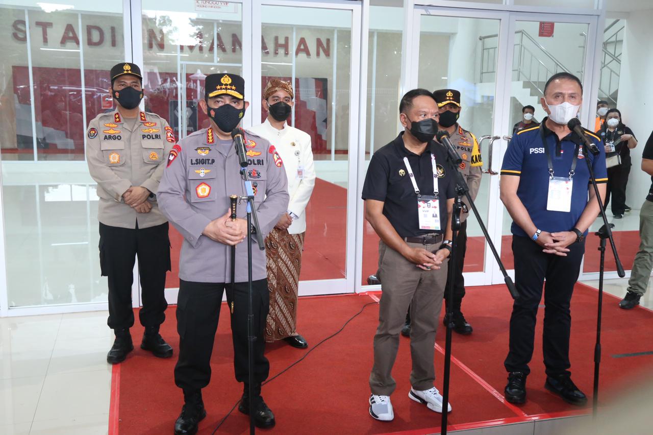 Kapolri kemudian melakukan swab antigen dan diberi tanda gelang dari kertas di pergelangan kanan. Saat mantan Kabareskrim Polri itu tiba, muncul Menpora Zainudin Amali dan ketua PSSI Muchamad Iriawan di stadion tersebut. Hadir pula Wali Kota Solo Gibran Rangkabuming.