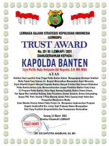 Kapolda Banten Irjen Rudy di hari yang sama menerima “Trust Award” dari Lembaga Kajian Strategis Kepolisian Indonesia (LEMKAPI) kepada Polda Banten atas “Loyalitas dan Dedikasi yang Tinggi Dalam Pengungkapan Sejumlah Sindikat Mafia Tanah” dalam Tahun 2021.