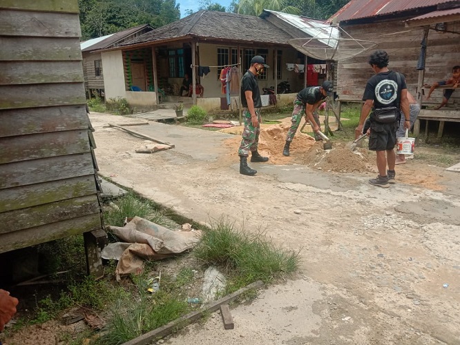 Sambas-Kalbar, Skalainfo.net| Satgas Pamtas RI-Malaysia Yonif 642/Kapuas Pos Sei Bening bersama warga masyarakat melaksanakan karya bakti perbaikan jalan dengan melaksanakan penambalan jalan di Dusun Air Bening, Desa Sungai Bening, Kecamatan Sajingan Besar, Kabupaten Sambas, Kalimantan Barat.