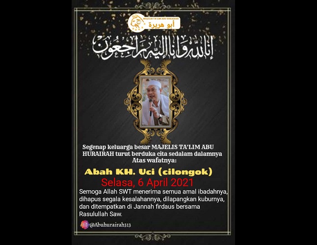 Tangerang, Skalainfo.net| Kabar Duka Cita Pimpinan Pondok Pesantren Al Istiqaliyah Abuya KH. Uci Kurtusi Bin Abuya KH. Damiati Cilongok Desa Sukamantri Kecamatan Pasar Kemis Kabupaten Tangerang sudah tutup usia. Kiyai Kharismatik dan yang akrab dipanggil Abah Abuya KH. Uci, tutup usia, meninggal dunia pada hari Selasa, 6/4/2021 di kediamannya pukul 05.30 WIB.