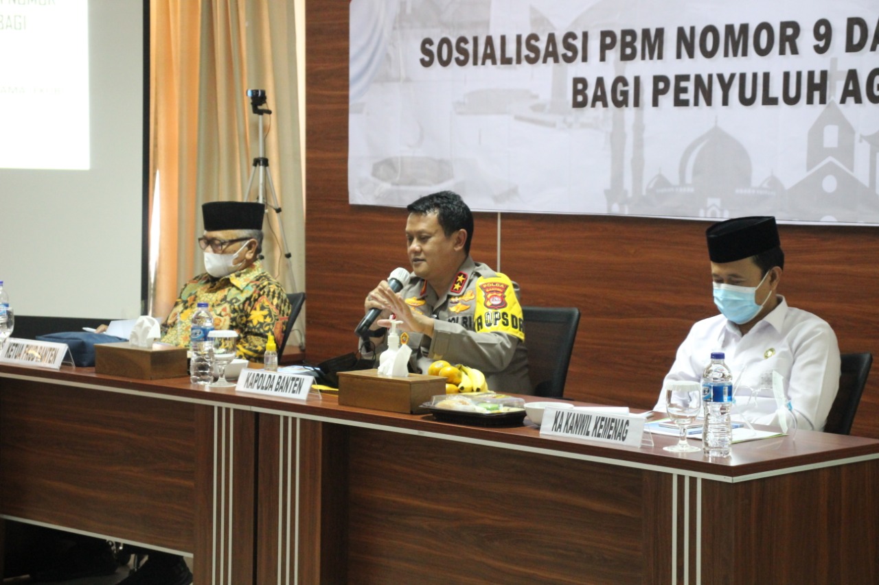 SERANG, skalainfo.net | Kapolda Banten Irjen Pol Dr. Rudy Heriyanto menjadi Key Note Speech dalam kegiatan Sosialisasi PBM Nomor 9 dan 8 tahun 2006 bagi penyuluhan agama yang diselenggarakan di salah satu hotel yang ada di Kota Serang, Rabu (07/04/2021).
